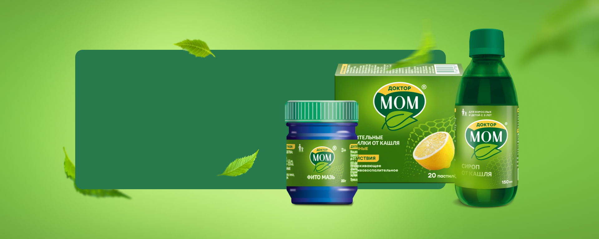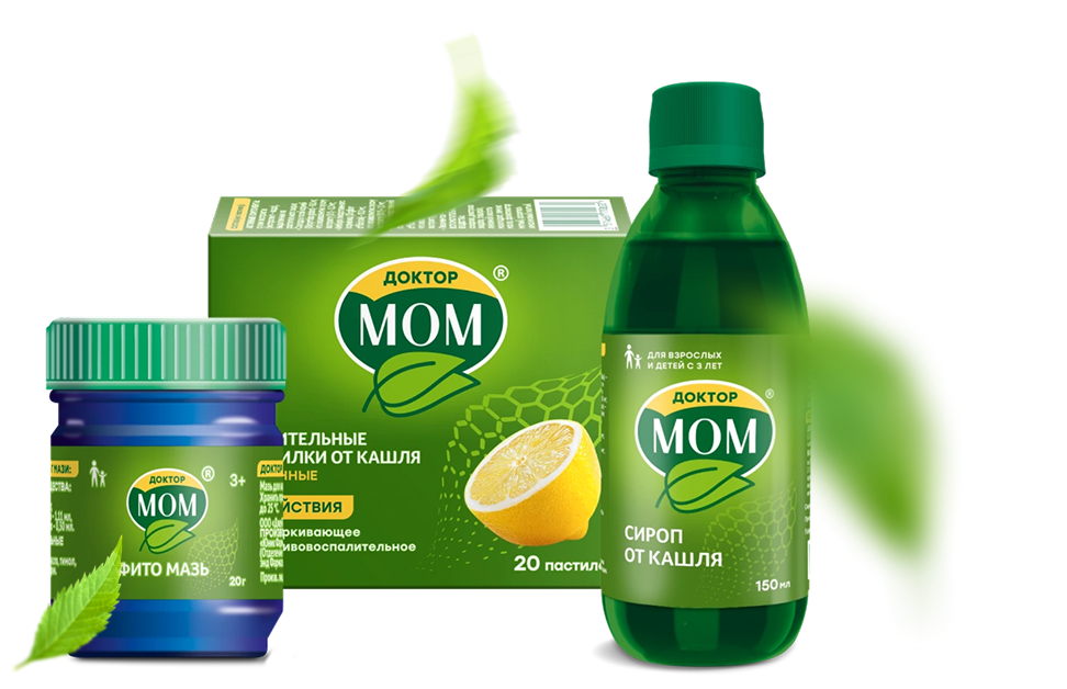 Линейка Доктор МОМ® включает сироп и пастилки от кашля, а также мазь от симптомов простуды. Сироп и мазь Доктор МОМ® рекомендованы к применению взрослым и детям с появлением первых симптомов ОРВИ, характеризующихся повышением температуры тела и другими признаками.